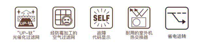 室內機靜音運轉,多檔風量調節,面板開閉功能,窗簾遮擋板,液晶顯示,故障自動顯示,極速運轉,環抱氣流。